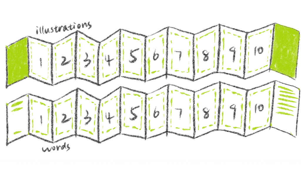 The visual format of the concertina book serves as the medium for presenting the illustrations. Its concise folding structure enhances the coherence of the illustrations’ reading experience while adding interest and flexibility. Additionally, the concertina book format allows for the creation of postcard books, where readers can tear off their favorite postcards along the dotted lines and carry them with ease.